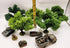 5 trees per set, hand-built and flocked canopies in a range of natural greens — deep forest, mid-tone, and bright highlight varieties. No two are identical. Your woods look like woods, not a display case.